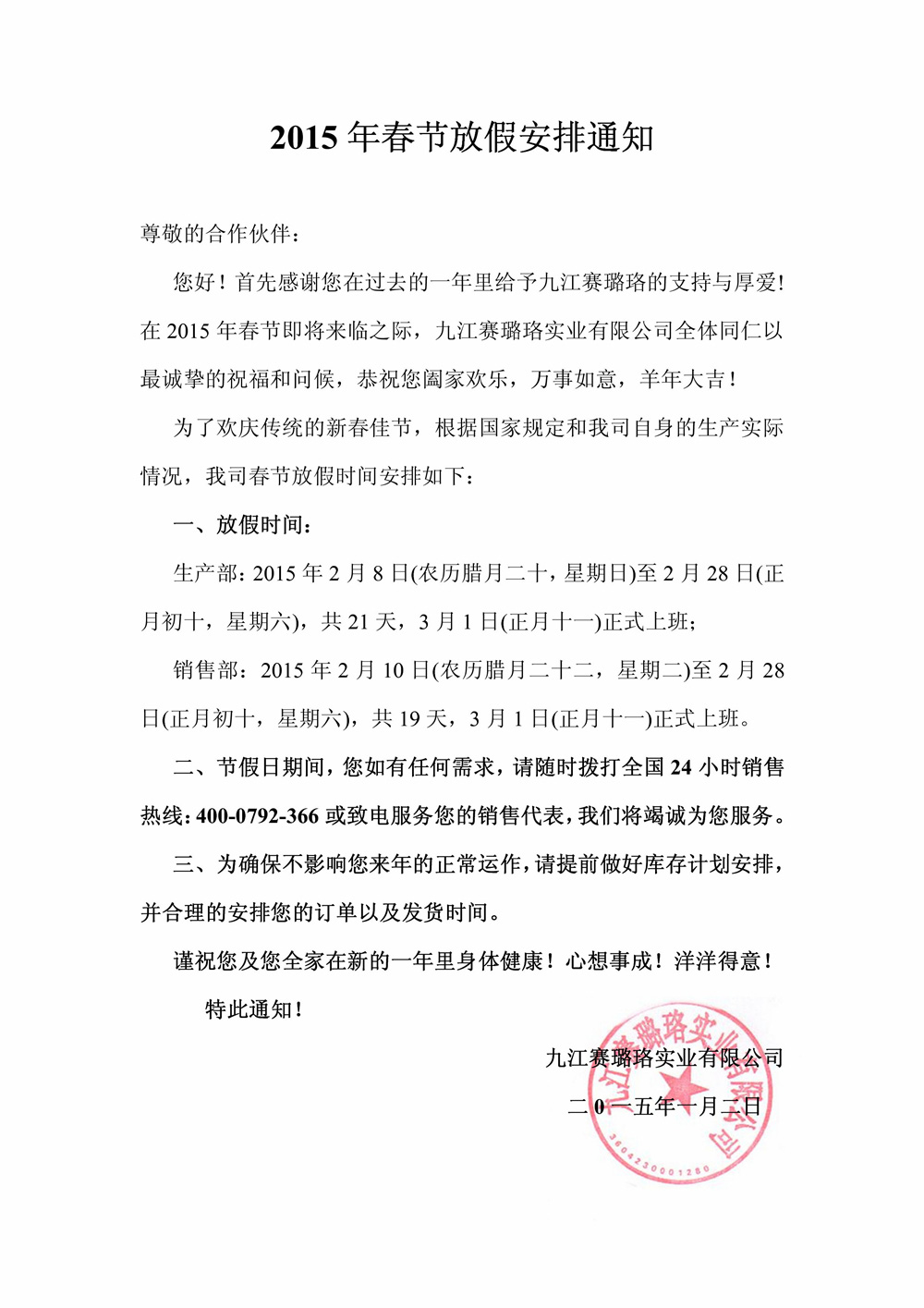 您好!首先感謝您在過去的一年里給予九江賽璐珞的支持與厚愛! 在2015年春節(jié)即將來臨之際,九江賽璐珞實業(yè)有限公司全體同仁以最誠摯的祝福和問候,恭祝您闔家歡樂,萬事如意,羊年大吉!