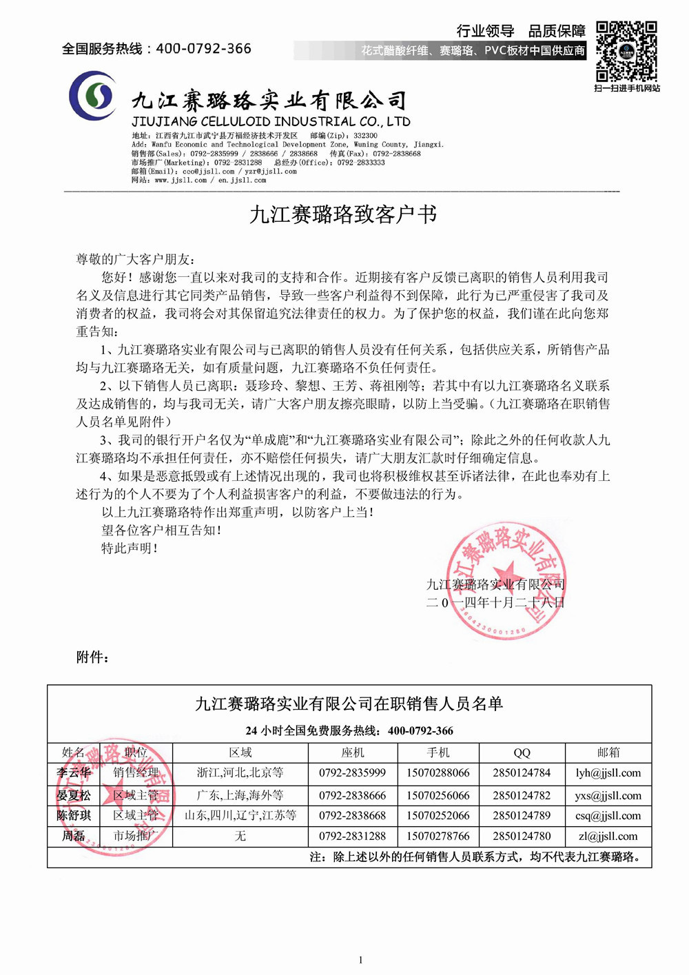 2、以下銷售人員已離職:聶珍玲、黎想、王芳、蔣祖剛等;若其中有以九江賽璐珞名義聯(lián)系及達(dá)成銷售的,均與我司無(wú)關(guān),請(qǐng)廣大客戶朋友擦亮眼睛,以防上當(dāng)受騙。(九江賽璐珞在職銷售人員名單見(jiàn)附件)