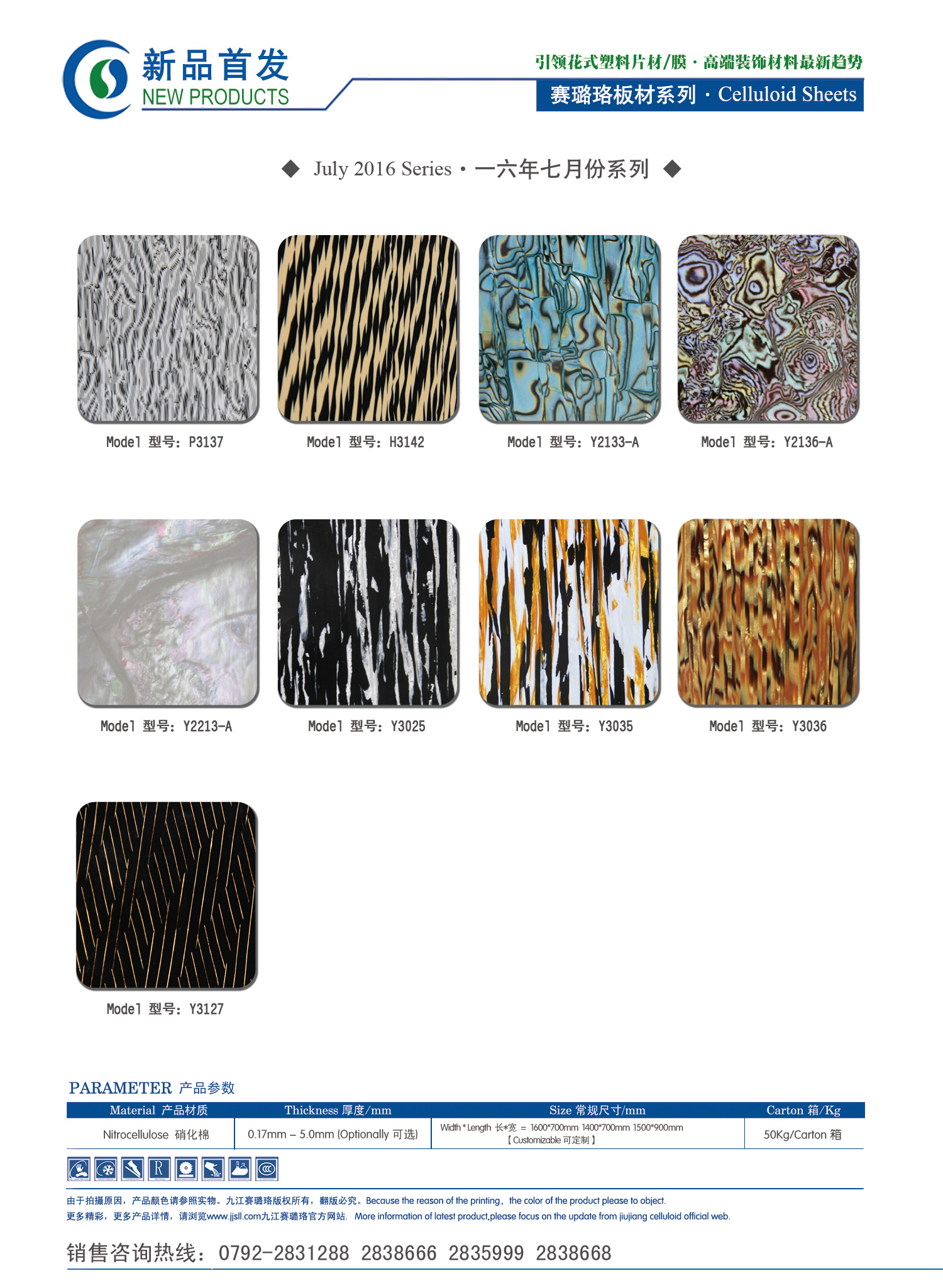 九江賽璐珞實(shí)業(yè)有限公司2016年七月份賽璐珞板材、瑪瑙膜、理石膜、樂器裝飾材料、花式PVC片材新品發(fā)布,引領(lǐng)花式塑料片材/膜·高端裝飾材料最新趨勢。咨詢熱線:0792-2838668 / 2838666 / 2835999。