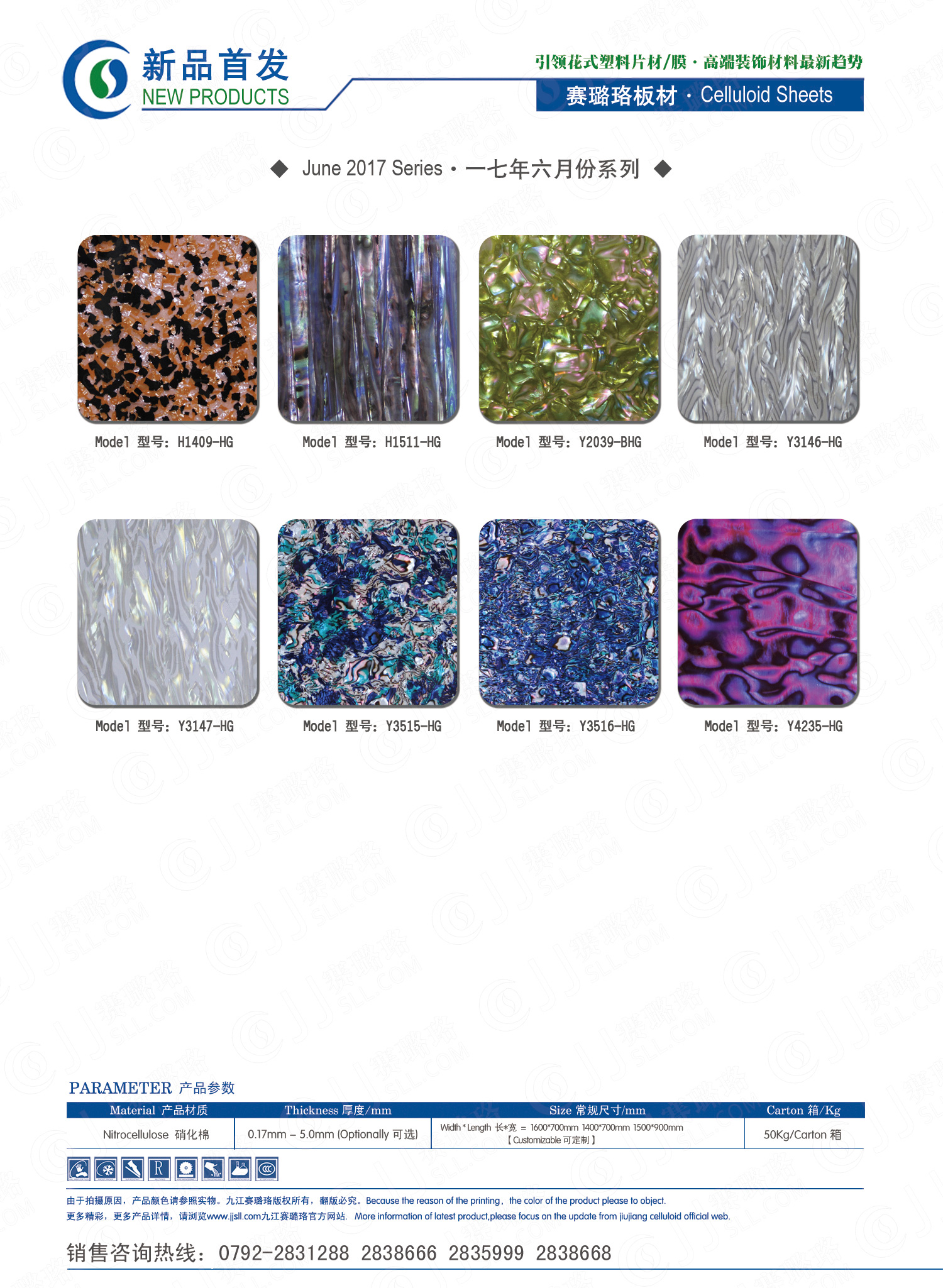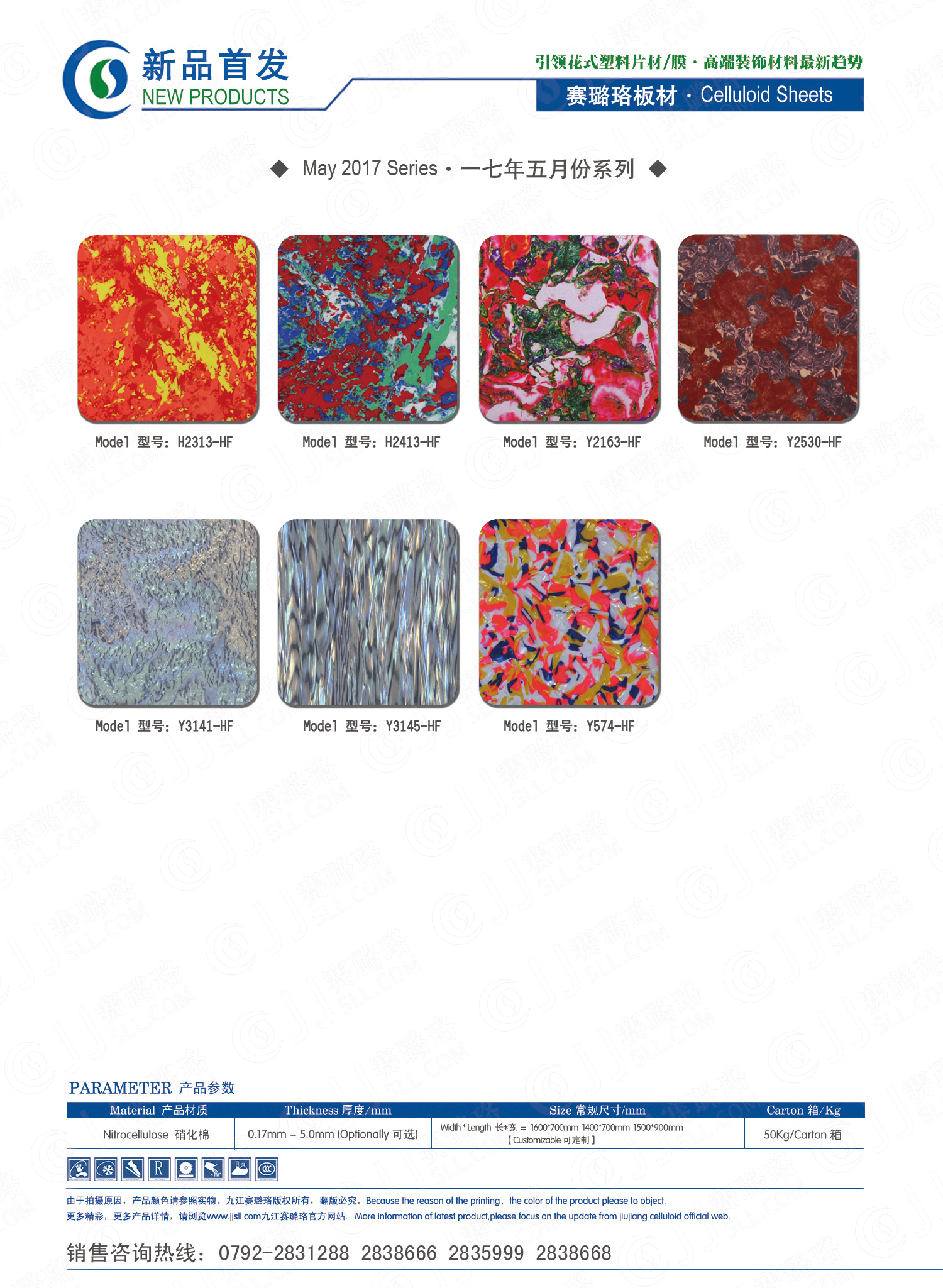 九江賽璐珞實(shí)業(yè)有限公司2017年五月及六月份賽璐珞板材、瑪瑙膜、理石膜、樂器裝飾材料、花式PVC片材新品發(fā)布,花式塑料片材/膜·多彩裝飾材料先驅(qū)者。咨詢熱線:0792-2838668 / 2831288 / 2838666 / 2835999。點(diǎn)擊圖片查看詳細(xì)產(chǎn)品